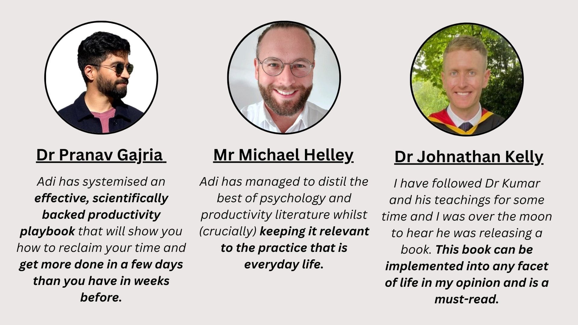 "Mr. Adi Kumar's book is an exceptionally valuable resource for anyone (and especially busy house officers and surgical trainees) seeking to enhance their time management skills and create and more fulfilling life. Since reading this book, I have been invited to give an oral presentation at an international surgical conference, I’ve had one article accepted for publication and have continued to make strides on other projects that are important to me. Notably, this has been the case while being a much better husband and father. When compared to my prior self, the stress and anxiety stemming from my clinical duties, my research activities and the incessant hurdles that come with the pursuit of a surgical career have all been significantly reduced to the point of manageability. And I attribute this directly to Mr. Kumar's approach." - Dr Eduardo Apellaniz
