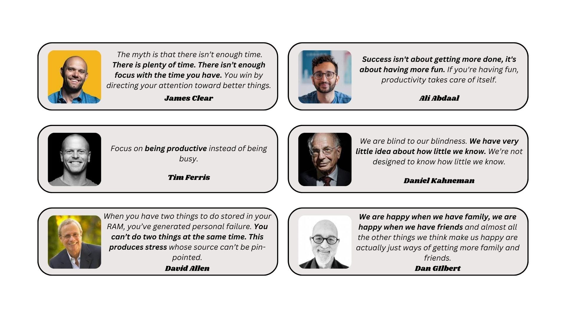 James Clear's Atomic Habits. Daniel Kahneman's Thinking, Fast and Slow. Dan Gilbert's Stumbling Upon Happiness. Getting Things Done by David Allen. All of Ali Abdaal's courses, and much more.